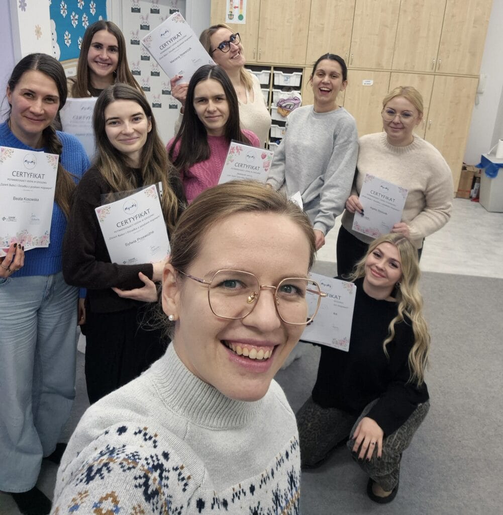 - Możliwość kontynuacji warsztatów. Do tej pory zrealizowane zostały 2 części warsztatów modułowych, w których udział wzięło już ponad 200 nauczycieli z całej Polski. Każda część warsztatów skład się z 4 spotkań, obejmuje tematy bliskie dzieciom i nauczycielom, zawiera autorski materiał i uwzględnia potrzeby i wyzwania dzieci odkrywających świat języka migowego. Wyczekiwana przez uczestników część trzecia jest w trakcie tworzenia! 😊